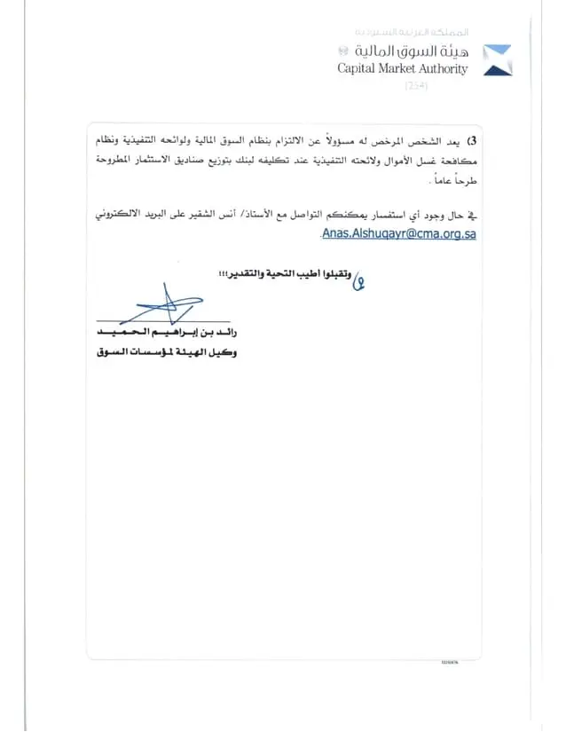 نفيدكم أنه بناءً على نظام السوق المالية الصادر بالمرسوم الملكي رقم (م/30) وتاريخ 02-06-1424هـ، وبعد التنسيق مع مؤسسة النقد العربي السعودي، أصدر مجلس الهيئة قراره بتاريخ 24-05-1440هـ الموافق 30-01-2019هـ، المتضمن السماح للأشخاص المرخص لهم بتكليف البنوك والمصارف العاملة في المملكة (“البنك”) بتوزيع صناديق الاستثمار المطروحة طرحاً عاماً شريطة الالتزام بالمتطلبات الآتية: