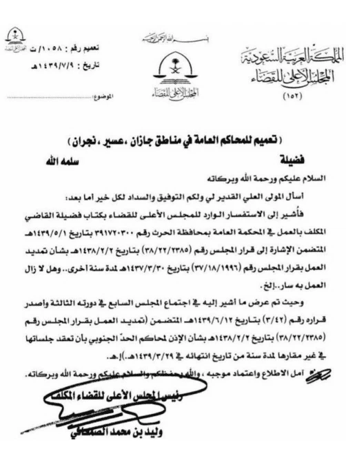 التعميم رقم (1058/ت) بتاريخ 09-07-1439هـ يشير إلى قرار المجلس الأعلى للقضاء بتمديد الإذن لمحاكم الحد الجنوبي (في مناطق جازان، عسير، ونجران) لعقد جلساتها في أماكن غير مقارها الرسمية لمدة سنة إضافية، اعتباراً من تاريخ انتهاء القرار السابق في 29-03-1439هـ. هذا التمديد جاء استجابة للاستفسار الموجه للمجلس حول استمرار سريان هذا الإجراء.