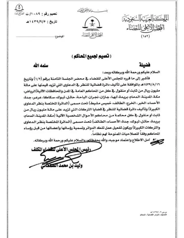 تعميم رقم (1089/ت) وتاريخ 05-09-1439هـ، الصادر عن المجلس الأعلى للقضاء في السعودية يهدف إلى إنشاء دوائر قضائية متخصصة للنظر في الدعاوى المالية والتركات التي تتجاوز قيمتها مائة مليون ريال.