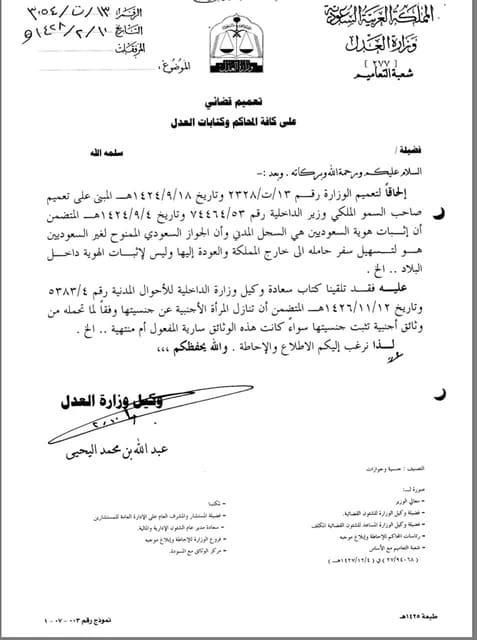 إلحاقاَ لتعميم الوزارة رقم 13/ت/2328 وتاريخ 18-09-1424هـ المبني علي تعميم صاحب السمو الملكي وزير الداخلية رقم 74464/53 وتاريخ 04-09-1424هـ المتضمن أن إثبات هوية السعوديين هي السجل المدني وأن الجواز السعودي الممنوح لغير السعوديين هو لتسهيل سفر حامله الي خارج المملكة والعودة إليها وليس لإثبات الهوية داخل البلاد..الخ.
