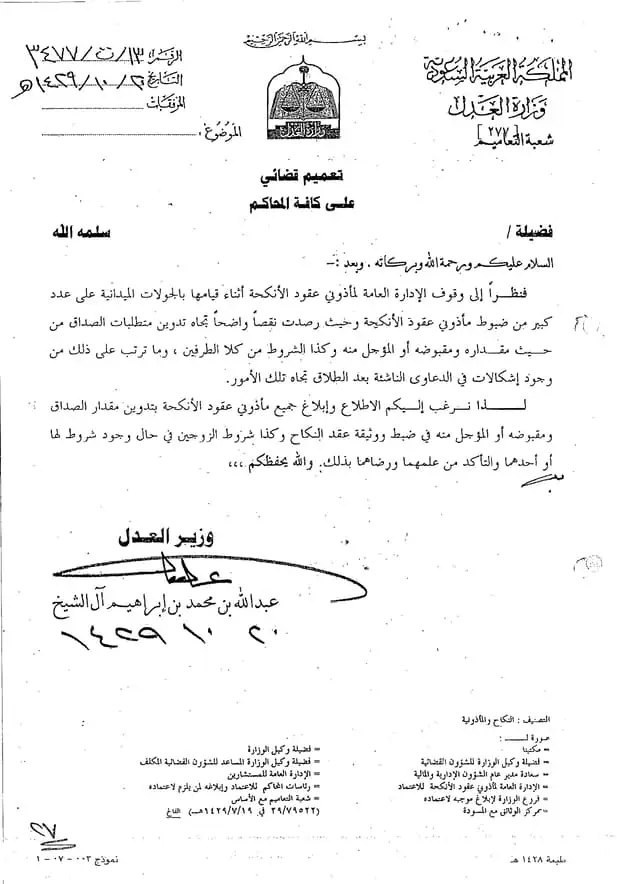 – هذا التعميم يُعتبر توجيهًا إجرائيًا ملزمًا لمأذوني الأنكحة باعتبارهم يعملون بترخيص من وزارة العدل وتحت إشرافها.