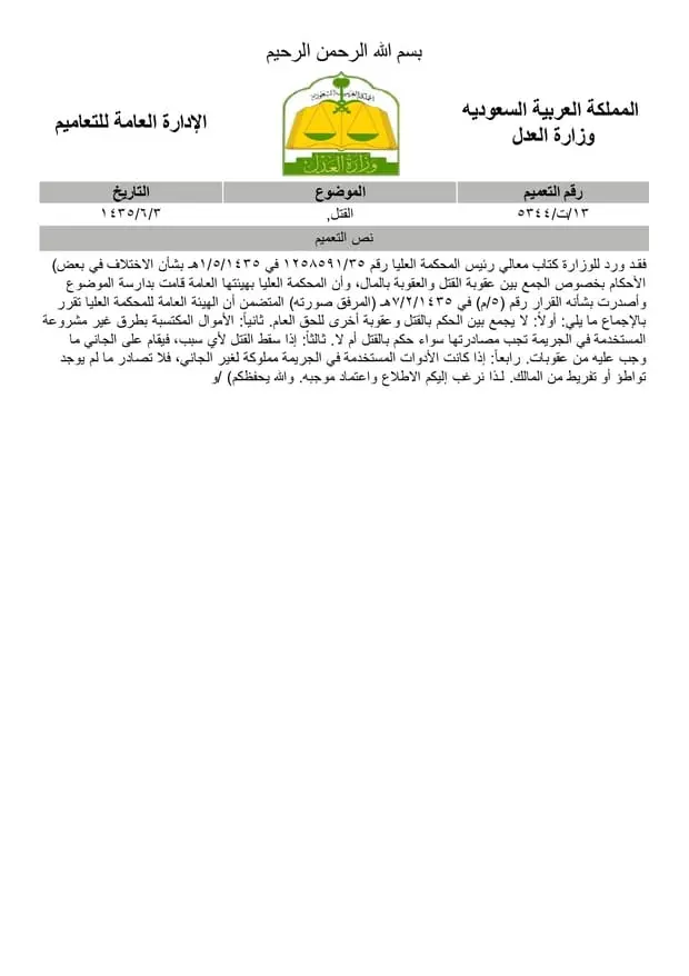 فقد ورد للوزارة كتاب معالي رئيس المحكمة العليا رقم 1258591/35 في 01-05-1435هـ بشأن الاختلاف في بعض (الأحكام بخصوص الجمع بين عقوبة القتل والعقوبة بالمال، وأنا المحكمة العليا بهيئتها العامة قامت بدارسة الموضوع وأصدرت بشأنه القرار رقم (5/م) في 07-02-1435هـ (المرفق صورته) المتضمن أن الهيئة العامة للمحكمة العليا تقرر بالإجماع ما يلي: أولاً: لا يجمع بين الحكم بالقتل وعقوبة أخرى للحق العام. ثانياً: الأموال المكتسبة بطرق غير مشروعة المستخدمة في الجريمة تجب مصادرتها سواء حكم بالقتل أم لا. ثالثاً: إذا سقط القتل لأي سبب، فيقام على الجاني ما وجب عليه من عقوبات. رابعاً: إذا كانت الأدوات المستخدمة في الجريمة مملوكة لغير الجاني، فلا تصادر ما لم يوجد تواطؤ أو تفريط من المالك. لذا نرغب إليكم الاطلاع واعتماد موجبه. والله يحفظكم) /و