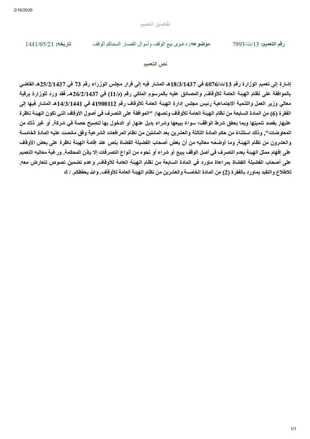 إشارة إلى تعميم الوزارة رقم 13/ت/6076 في 18-03-1437هـ المشار فيه إلى قرار مجلس الوزراء رقم 73 في 25-02-1437هـ القاضي بالموافقة على نظام الهيئة العامة للأوقاف, والمصادق عليه بالمرسوم الملكي رقم (م/11) في 26-02-1437هـ. فقد ورد للوزارة برقية معالي وزير العمل والتنمية الاجتماعية رئيس مجلس إدارة الهيئة العامة للأوقاف رقم 41900112 في 14-03-1441هـ المشار فيها إلى الفقرة (6) من المادة السابعة من نظام الهيئة العامة للأوقاف ونصها: “الموافقة على التصرف في أصول الأوقاف التي تكون الهيئة ناظرة عليها, بقصد تنميتها وبما يحقق شرط الواقف؛ سواءً ببيعها وشراء بديل عنها, أو الدخول بها لتصبح حصة في شركة, أو غير ذلك من المعاوضات”, وذلك استثناءً من حكم المادة الثالثة والعشرين بعد المائتين من نظام المرافعات الشرعية وفق مانصت عليه المادة الخامسة والعشرون من نظام الهيئة, وما أوضحه معاليه من أن بعض أصحاب الفضيلة القضاة ينص عند إقامة الهيئة ناظرة على بعض الأوقاف على إفهام ممثل الهيئة بعدم التصرف في أصل الوقف ببيع أو شراء أو نحوه من أنواع التصرفات إلا بإذن المحكمة. ورغبة معاليه التعميم على أصحاب الفضيلة القضاة بمراعاة ماورد في المادة السابعة من نظام الهيئة العامة للأوقاف, وعدم تضمين نصوص تتعارض معه. للاطلاع والتقيد بماورد بالفقرة (2) من المادة الخامسة والعشرين من نظام الهيئة العامة للأوقاف. والله يحفظكم.