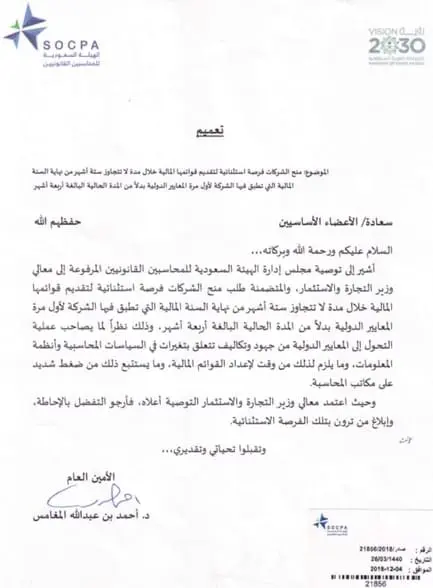 أشير إلى توصية مجلس إدارة الهيئة السعودية للمحاسبين القانونيين المرفوعة إلى معالي وزير التجارة والاستثمار، والمتضمنة طلب منح الشركات فرصة استثنائية لتقديم قوائمها المالية خلال مدة لا تتجاوز ستة أشهر من نهاية السنة المالية التي تطبق فيها الشركة لأول مرة المعايير الدولية بدلاً من المدة الحالية البالغة أربعة أشهر، وذلك نظراً لما يصاحب عملية التحول إلى المعايير الدولية من جهود وتكاليف تتعلق بتغيرات في السياسات المحاسبية وأنظمة المعلومات، وما يلزم لذلك من وقت لإعداد القوائم المالية، وما يستتبع ذلك من ضغط شديد على مكاتب المحاسبة.