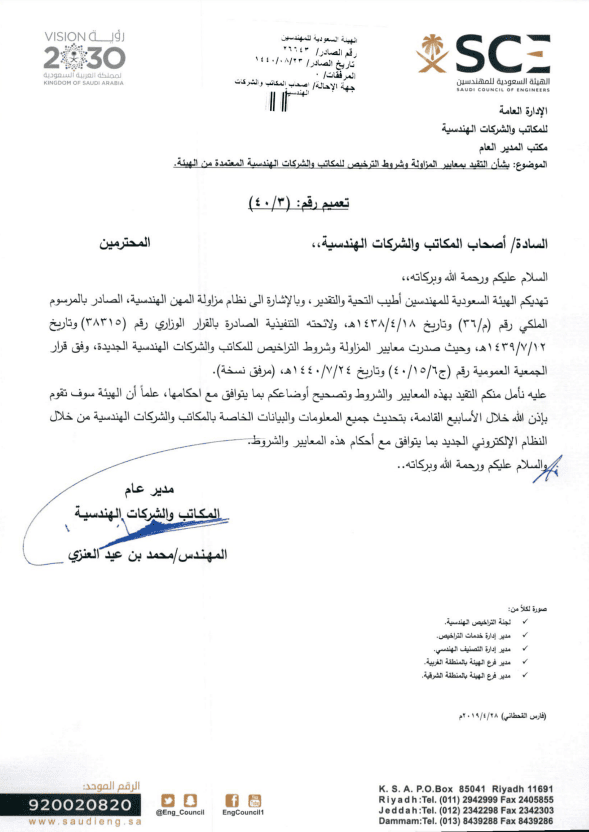 تهديكم الهيئة السعودية للمهندسين أطيب التحية والتقدير، وبالإشارة الى نظام مزاولة المهن الهندسية، الصادر بالمرسوم الملكي رقم (م/36) وتاريخ 18-04-1438هـ، ولائحته التنفيذية الصادرة بالقرار الوزاري رقم (38315) وتاريخ 12-07-1439هـ، وحيث صدرت معايير المزاولة وشروط التراخيص للمكاتب والشركات الهندسية الجديدة، وفق قرار الجمعية العمومية رقم (ج6 /40/15) وتاريخ 24-07-1440هـ، (مرفق نسخة).