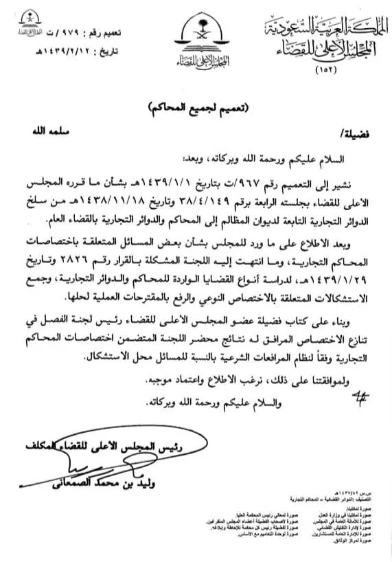 نشير إلى التعميم رقم 967/ت بتاريخ 01-01-1439هـ بشأن ما قرره المجلس الأعلى للقضاء بجلسته الرابعة برقم 38/4/149 وتاريخ 18-11-1438هـ من سلخ الدوائر التجارية التابعة لديوان المظالم إلى المحاكم والدوائر التجارية بالقضاء العام.