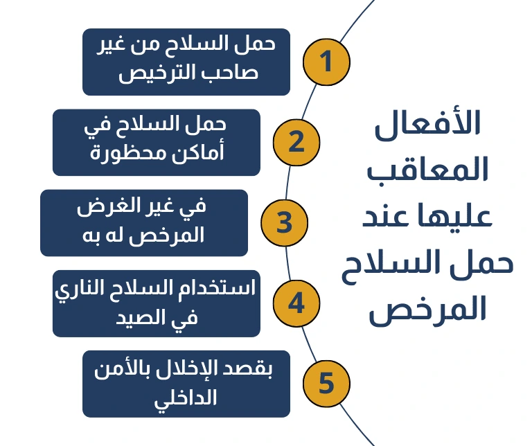 تختلف العقوبات التي يمكن إنزالها على حامل السلاح المرخص، باختلاف نوع الفعل المُجرَّم الذي يقوم به، وهذه الأفعال وعقوباتها تتمثل فيما يلي: