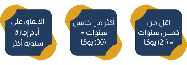 3- اتفاق صاحب العمل مع العامل: فقد أعطى المنظم الحق لصاحب العمل الاتفاق مع العامل على منحه عدد أيام إجازة سنوية أكثر من الحد الأدنى المقرر نظامًا، حيث يحق لصاحب العمل منح العامل عدد (30) يوم إجازة سنوية للعامل عن الخمس سنوات الأولى أو يمنح العامل عدد (45) يوم إجازة سنوية إذا وصلت مدة خدمة العامل إلى خمس سنوات متصلة فأكثر.